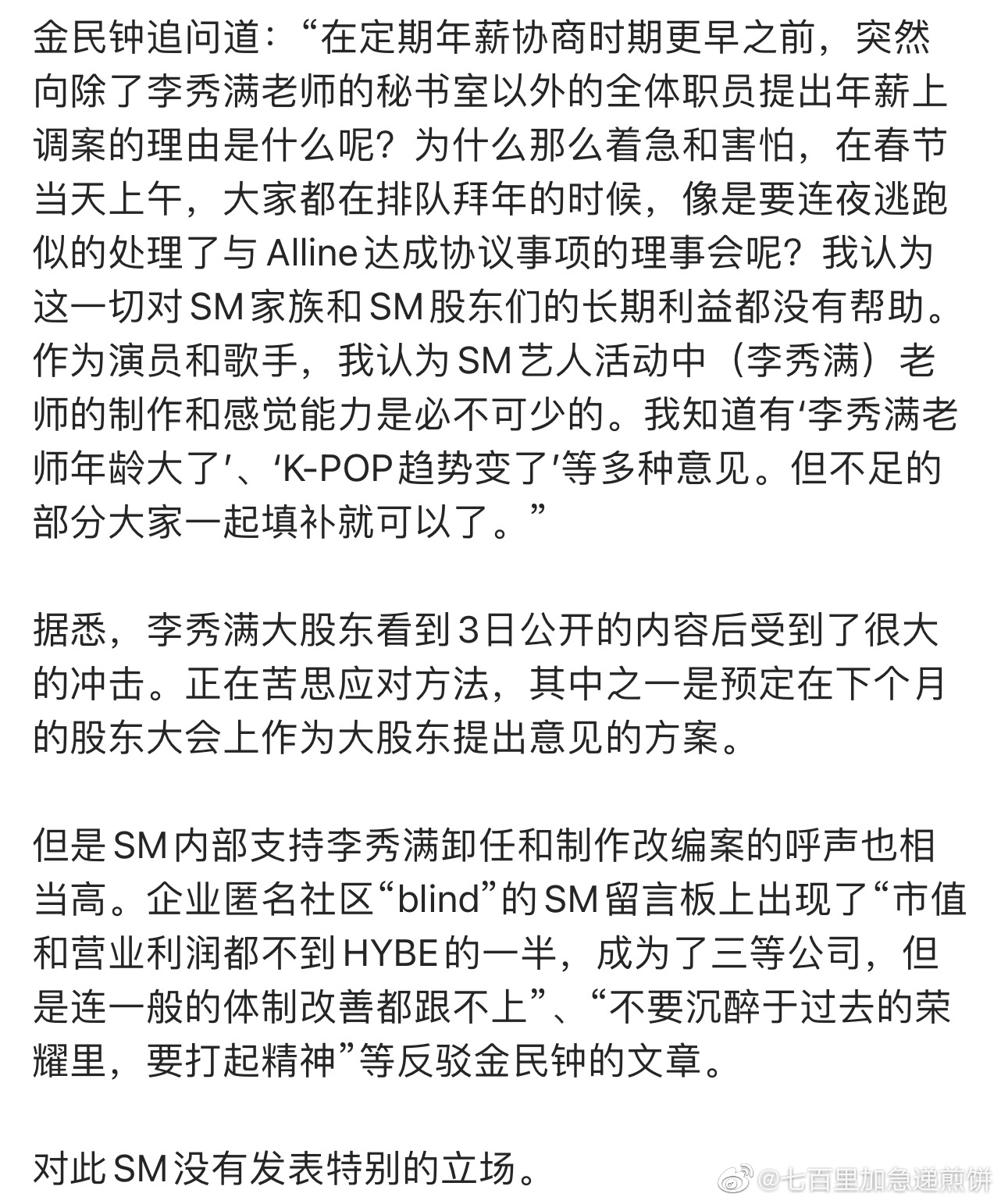 歌手兼演员金民钟表示,S.M.的共同代表李成洙和卓英俊断绝了与李秀满的所有对话,也没有在内部和李秀满进行任何商议,单方面发表了李秀满退出的消息。