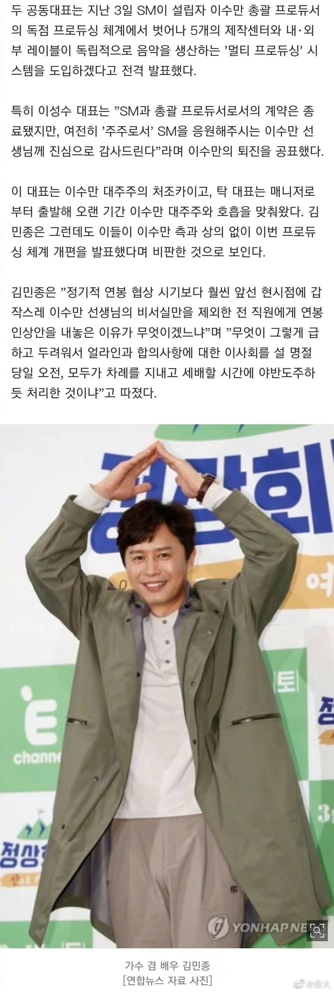Omg ,歌手兼演员金民钟表示,李成洙和卓英俊断绝了与李秀满的所有对话,没有与李秀满方面进行任何商议,单方面发表了李秀满退出的消息。