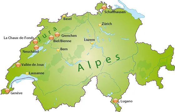 当我们打开瑞士制表地图,会发现日内瓦、汝山谷、纳沙泰尔、拉绍德封、比尔、沙夫豪森……在瑞士的西部形成了一条自南向北的“制表带”,而这些钟表城除了比尔与沙夫豪森,其他无一例外都位于法语区。
