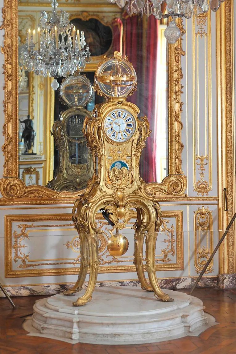 奢华钟表也是路易十四的炫富利器,凡尔赛宫的“国王大公寓”里就摆着制表师安托万·莫朗送给他的座钟,虽然看上去就像是个金碧辉煌的柜橱,但也设置了巧妙的机关,启动时希腊女神会出来为国王加冕。