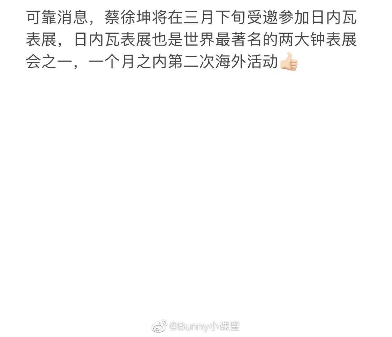 ??,蔡徐坤将在三月底受邀参加全球最大的钟表展会——日内瓦表展,这哥的时尚资源真是一路领跑
