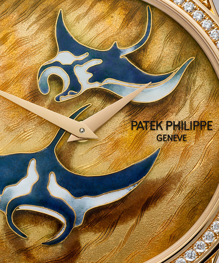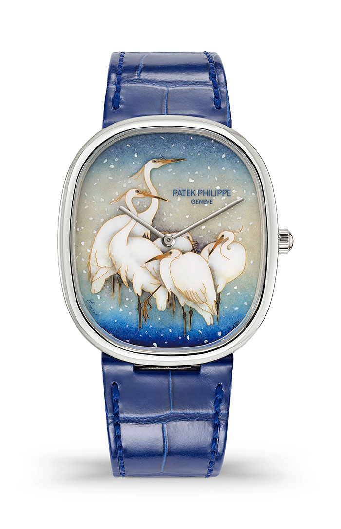 以陆生动物为灵感的动物肖像焕现灵动生机,映现于Ref.995/137J-001“猎豹”怀表上。Ref.5077/100R-064“沙土上的蝠鲼”Calatrava腕表采用手工雕刻黄金表盘,呈现精巧的线条起伏,并覆以大明火掐丝珐琅。Ref.5738/50G-026“白鹭”GoldenEllipse腕表配备掐丝珐琅表盘,图案灵感源自创作于1920年代的一幅日本版画。圆顶座钟饰以山楂、玉兰、银杏叶、荷花和苔藓等全球各地的植物,呈现华丽缤纷的色彩,展示了隆格维珐琅彩釉工艺等多项技艺。其他作品则巧妙融汇花卉与蝴蝶或花鸟元素,打造精美构图。
