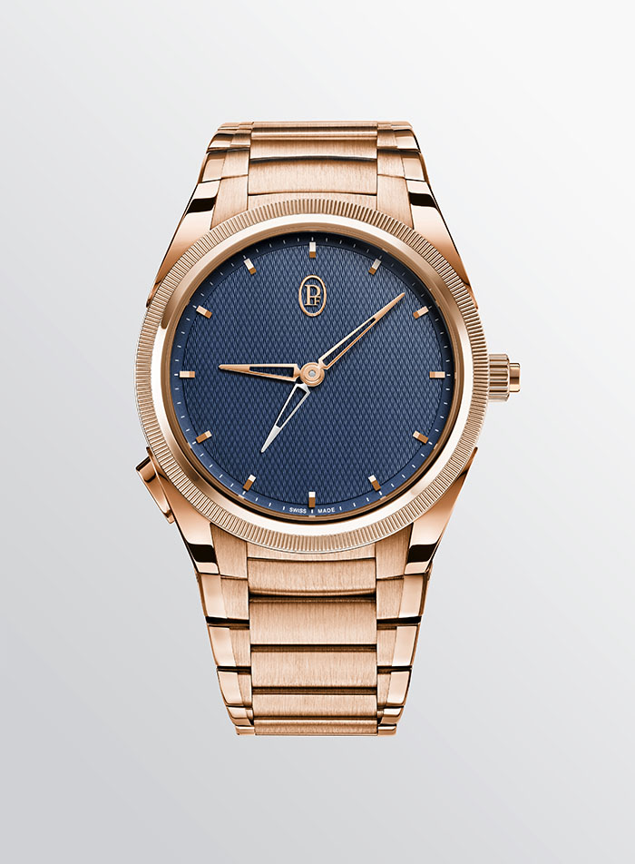 Tonda PF系列追针两地时腕表以18K玫瑰金材质回归,表盘上雅致入微的“格状大麦粒”玑镂饰纹搭配“米兰蓝”色调,仅呈现双时区以及分钟等必要计时元素。该复杂功能腕表配备重叠时针,是穿梭于不同时区的环球旅行者的理想之选。