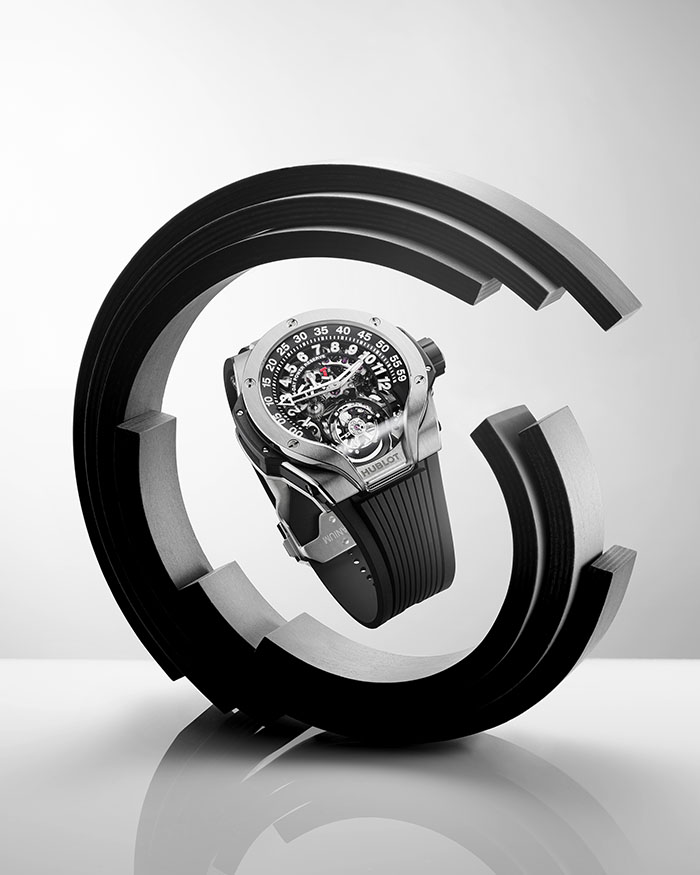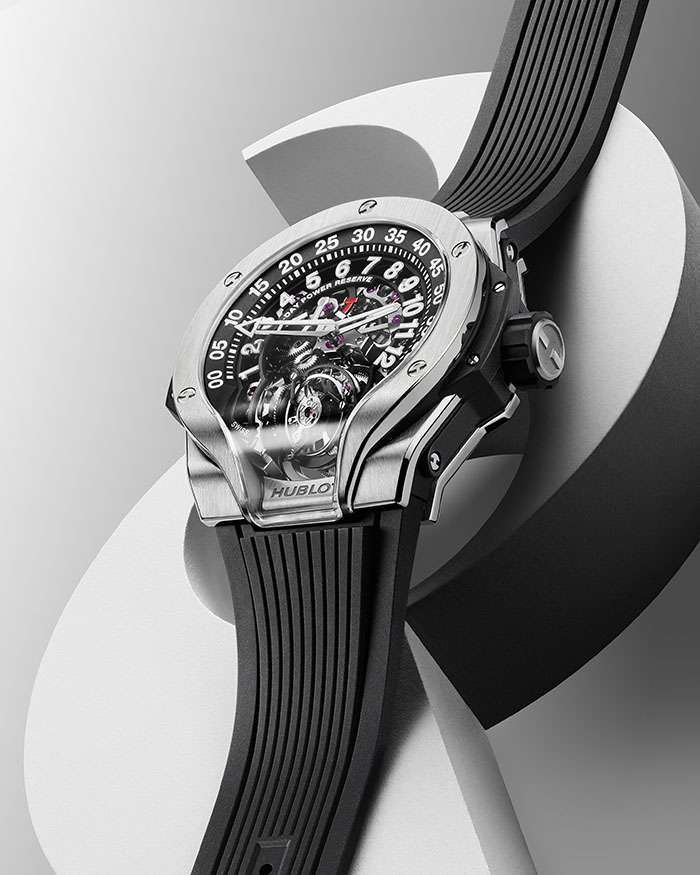 Big Bang MP-13腕表配备44毫米直径表壳,采用磨砂钛金属材质制成,并首次将陀飞轮与逆跳显示两大复杂功能融合于同一款腕表中。全新腕表通体由钛金属打造,采用缎面润饰工艺,并包含374个组件,配备黑色橡胶表带。