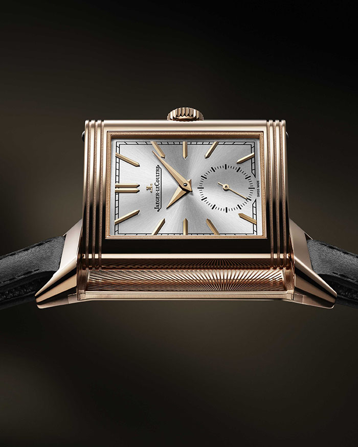 Reverso Tribute翻转系列的玫瑰金表壳经重新设计,厚度缩减至7.56毫米,尽显精致优雅。太阳放射状饰纹表盘经过精细处理,呈现特有的色调变幻,并突显纹理分明的太阳放射饰纹效果。该系列的四款表盘各具特色。黑色表盘搭配全新设计的玫瑰金表壳,与抛光金属形成强烈对比,致敬1931年Reverso翻转系列原型腕表;勃艮第红色漆面表盘与闪耀浓郁的玫瑰金相得益彰;银色表盘则与第一代Reverso翻转系列腕表的银色表盘相呼应,低调优雅地衬托金属温润的金色光芒。