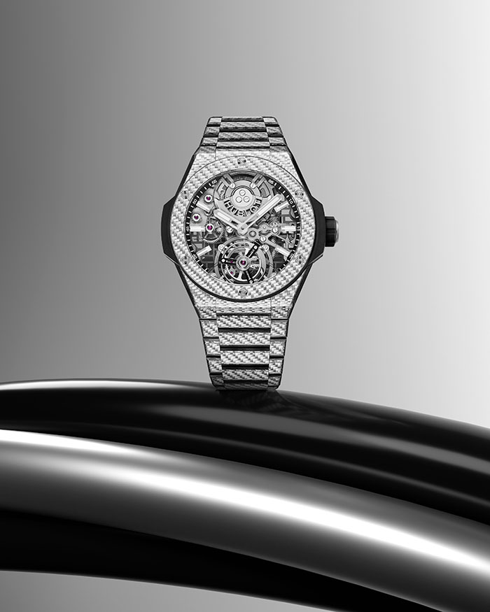 2023年新作的另一新颖之处,是以蛋白石色表盘搭配黑色镍金指针和时标,为精钢表壳增添活力四射的现代气息。2023年新款表盘汇集Reverso Tribute翻转系列腕表的所有标志性设计元素,以镶贴刻度时标代替数字时标,12时位置采用双重时标。时标的刻面造型与太子妃式指针相互映衬,令表盘更显深邃立体。位于表盘下半部分的小秒针表盘显示采用圆形轨道式刻度圈,与表盘和表壳的线性几何造型形成鲜明对比。翻转表壳时,框架内侧醒目的太阳放射状饰纹展露无遗,与表盘上的太阳放射状饰纹呼应。Reverso Tribute Small Seconds翻转系列小秒针腕表搭载积家822型手动上链机械机芯。这款机芯包含108枚零件,展现优雅的机械美感,性能稳定可靠,具备42小时动力储存。HUBLOT宇舶表于2023 “钟表与奇迹”高级钟表展重磅推出全新时计,发布集颠覆性、创造性与工艺性于一体的高级腕表杰作。