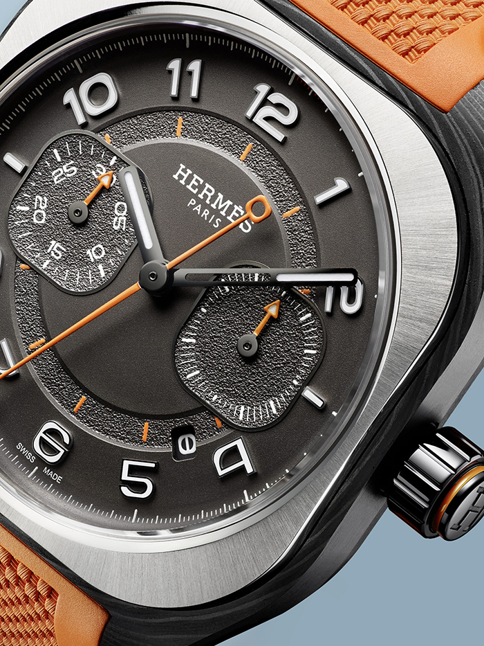 Hermès H08推出单按钮计时码表彰显运动精神。这款腕表的表壳由一块多层复合材料雕琢而成,经过缎面处理和抛光的钛合金表圈固定在饰有纹理的表壳中层。黑色表盘具有独特深邃感,上有两个计时积算盘和一个枕形日历视窗,以及黑色镍质指针和具备夜光涂层的数字和时标。橙色细节则突显整体的协调风格。