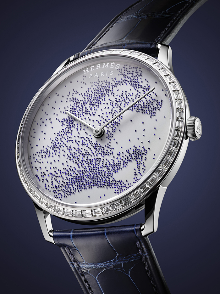 爱马仕Slim d’ Hermès Cheval de Legende腕表将蓝色珐琅与金质细珠相结合,表壳的圆形轮廓简单而不失别致,表耳棱角分明,白金珐琅表盘上的点点星光勾勒出一匹奔马,焕新诠释艺术家Benoit-Pierre Emery于2010年创作的同名丝巾图案。