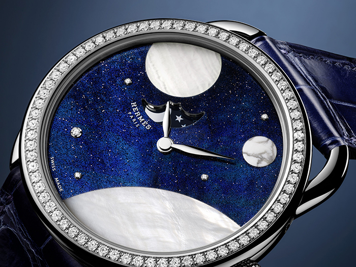 配备镶钻金质表壳的爱马仕Arceau Petite Lune腕表以宝石薄片在表盘上呈献交相辉映的星球群像。钻石的璀璨光辉映衬由砂金石、珍珠母贝、文石和蛋白石雕琢而成的星空世界,为表盘注入立体感和层次感。