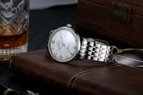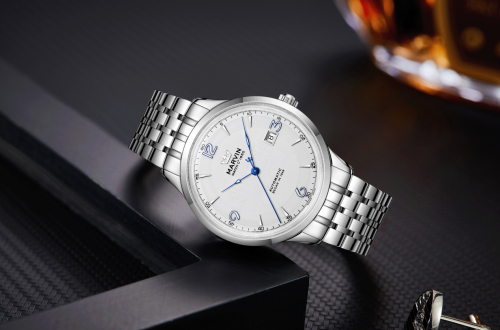整体外观延续摩纹一贯的经典美学。纯白表盘干净利落,搭配烤蓝柳叶指针与复古阿拉伯数字时标,3时位设有日历窗,细节之中展露优雅风范。摩纹标志性的“红8”DNA印记同样得以保留,成为传承的符号。而在功能层面,指针、时标、皇冠logo与建筑图案,均覆以瑞士进口夜光涂层,确保夜间读时的清晰性,同时增强整体视觉张力。