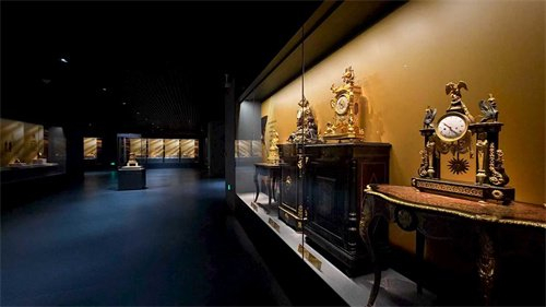 众多精彩展品吸引了不少观众驻足欣赏。来自20世纪英国的木制雕花座钟由英国著名钟表品牌DENT公司生产,座钟侧面背面均为镀金黄铜网面,钟匣为乌木雕饰,开门式表盘配以金属漆面和烤蓝指针。值得一提的是,始创于1814年的DENT公司也是英国著名地标——议会大厦大钟(又名大本钟)的设计和建造商。20世纪的法国铜镀金珐琅女神像座钟钟匣框架为铜鎏金,顶部平台为女神像,平台基座及钟座采用木制,木质材料与钟匣相接部分以掐丝珐琅装饰,钟匣主体面板选用有机玻璃和瓷质钟盘,钟体多处镶嵌人造宝石饰物。19世纪的法国铜镀金珐琅人物雕塑三件套壁炉钟,则由两架双支烛台和一架时钟构成,骨架部分黄铜镀金,陶瓷器件镶嵌其中。